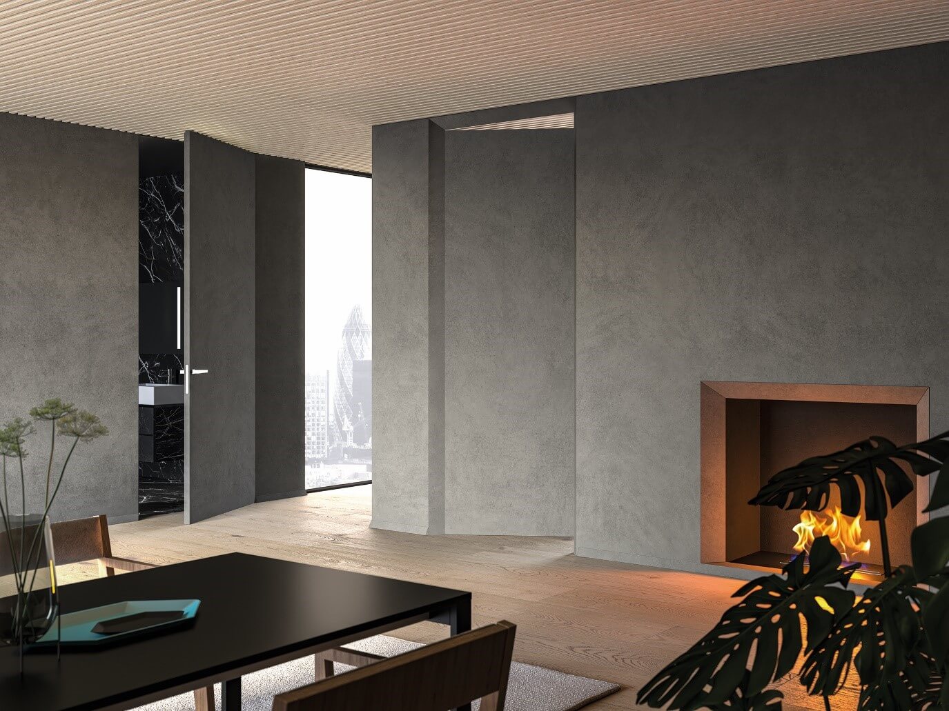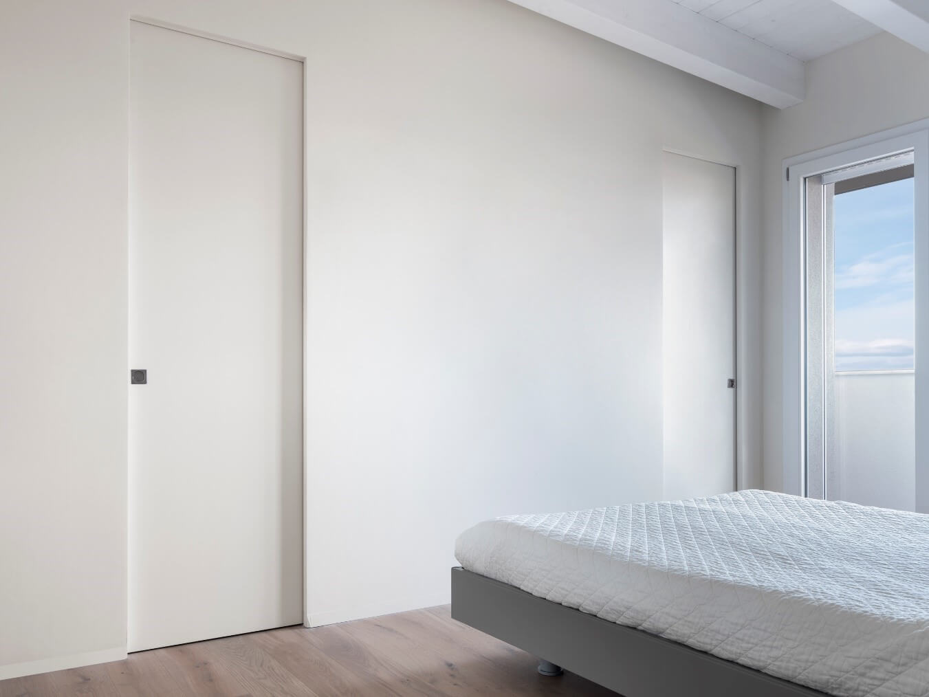 Drzwi chowane w ścianę bez ościeżnicy, nie posiadają drewnianych elementów wykończeniowych. Skrzydło drzwiowe wsuwa się bezpośrednio w ścianę, tworząc jednolitą, gładką powierzchnię.